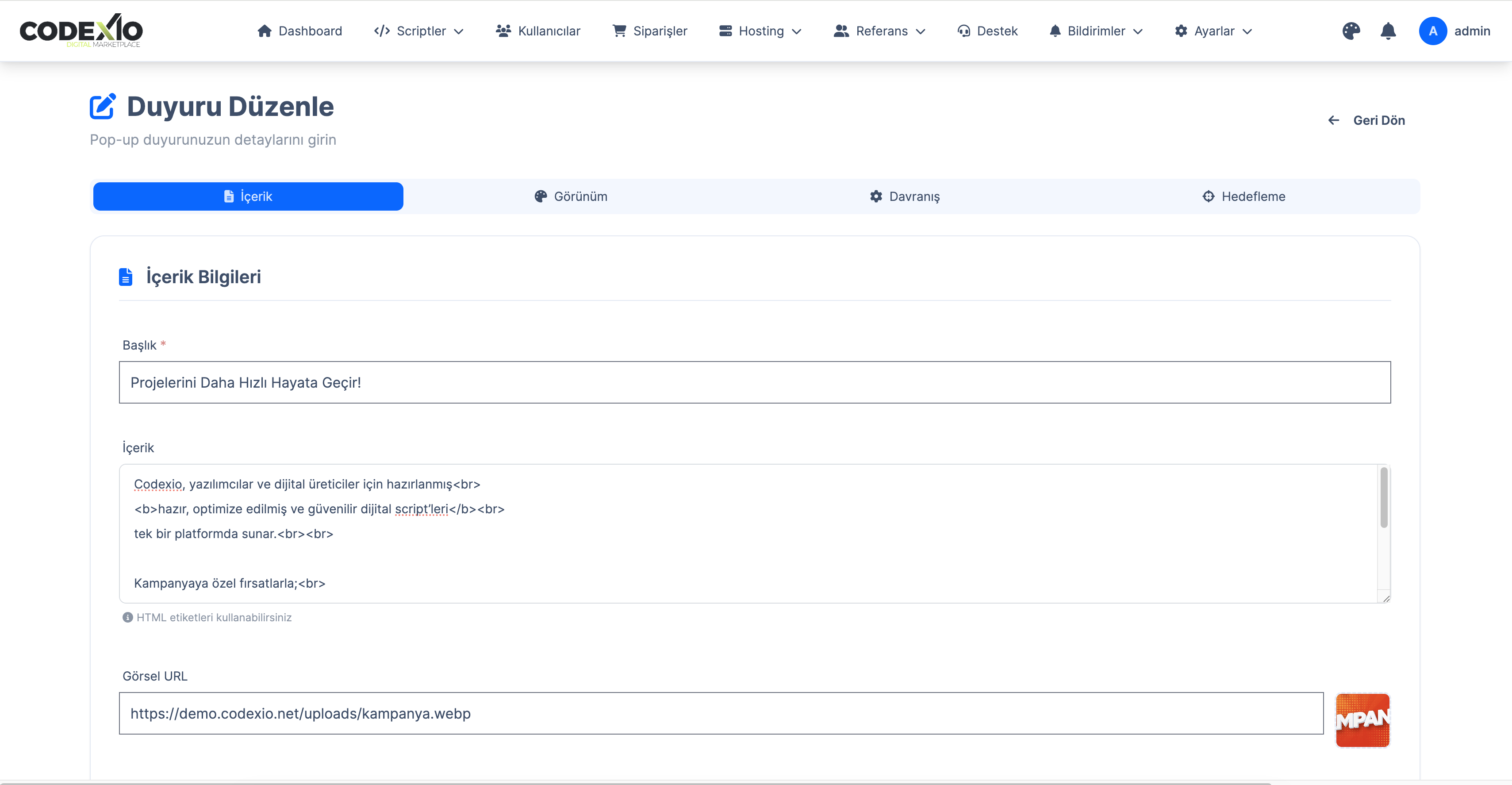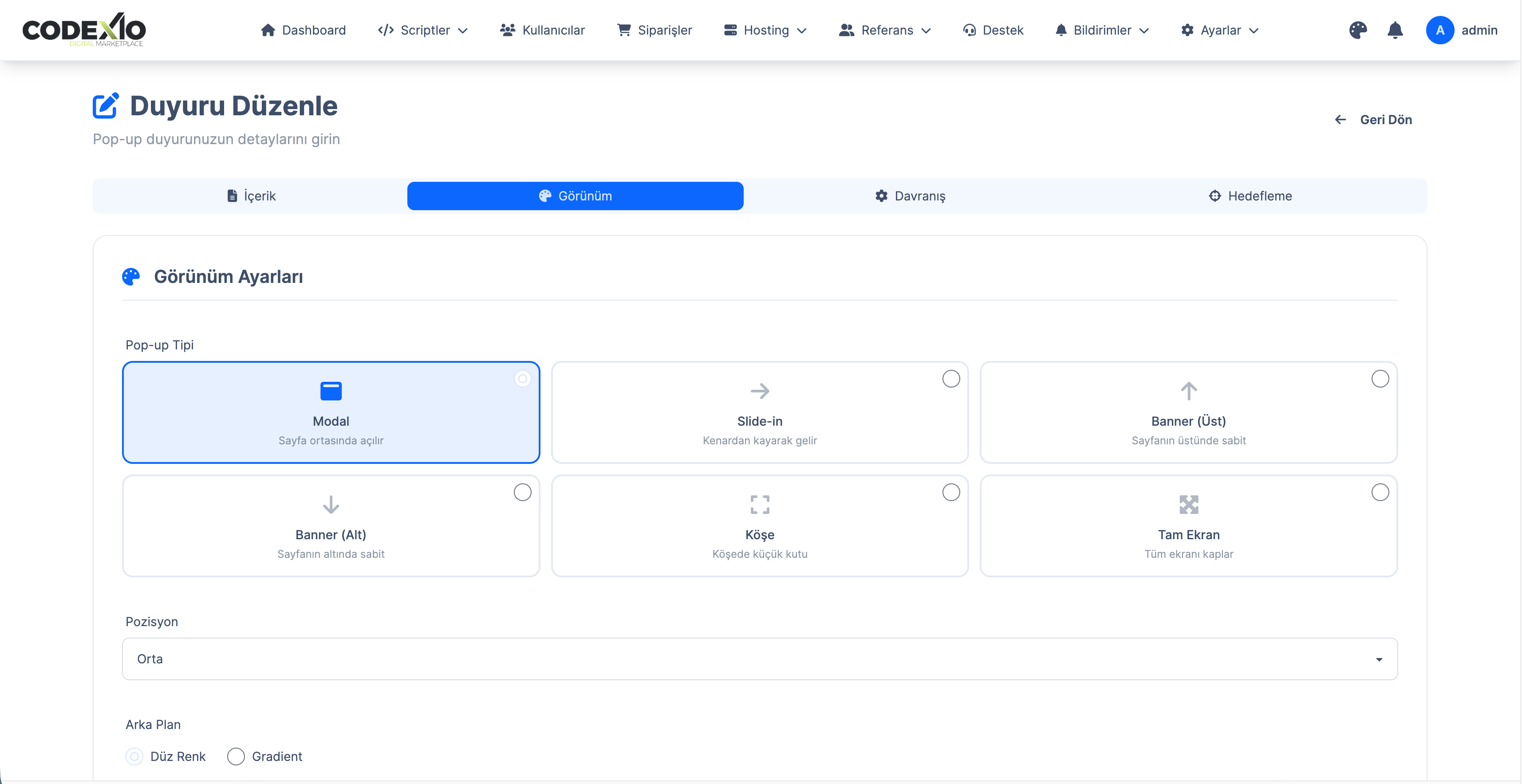 Bu modül sayesinde ziyaretçilerinize veya giriş yapmış kullanıcılarınıza özel pop-up duyurular gösterebilir; kampanyalar, bakım bildirimleri, önemli haberler veya sistem mesajlarını etkili bir şekilde iletebilirsiniz.