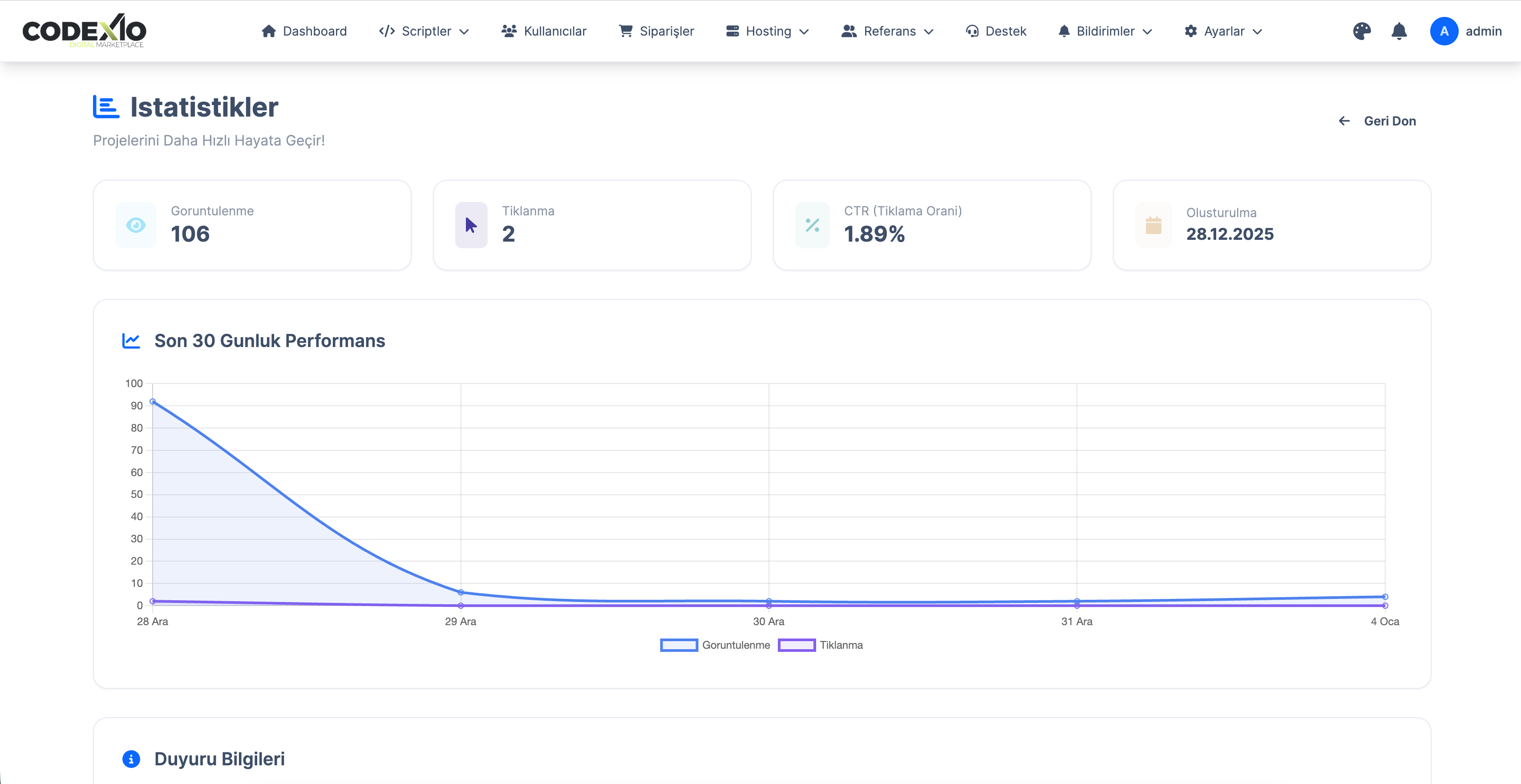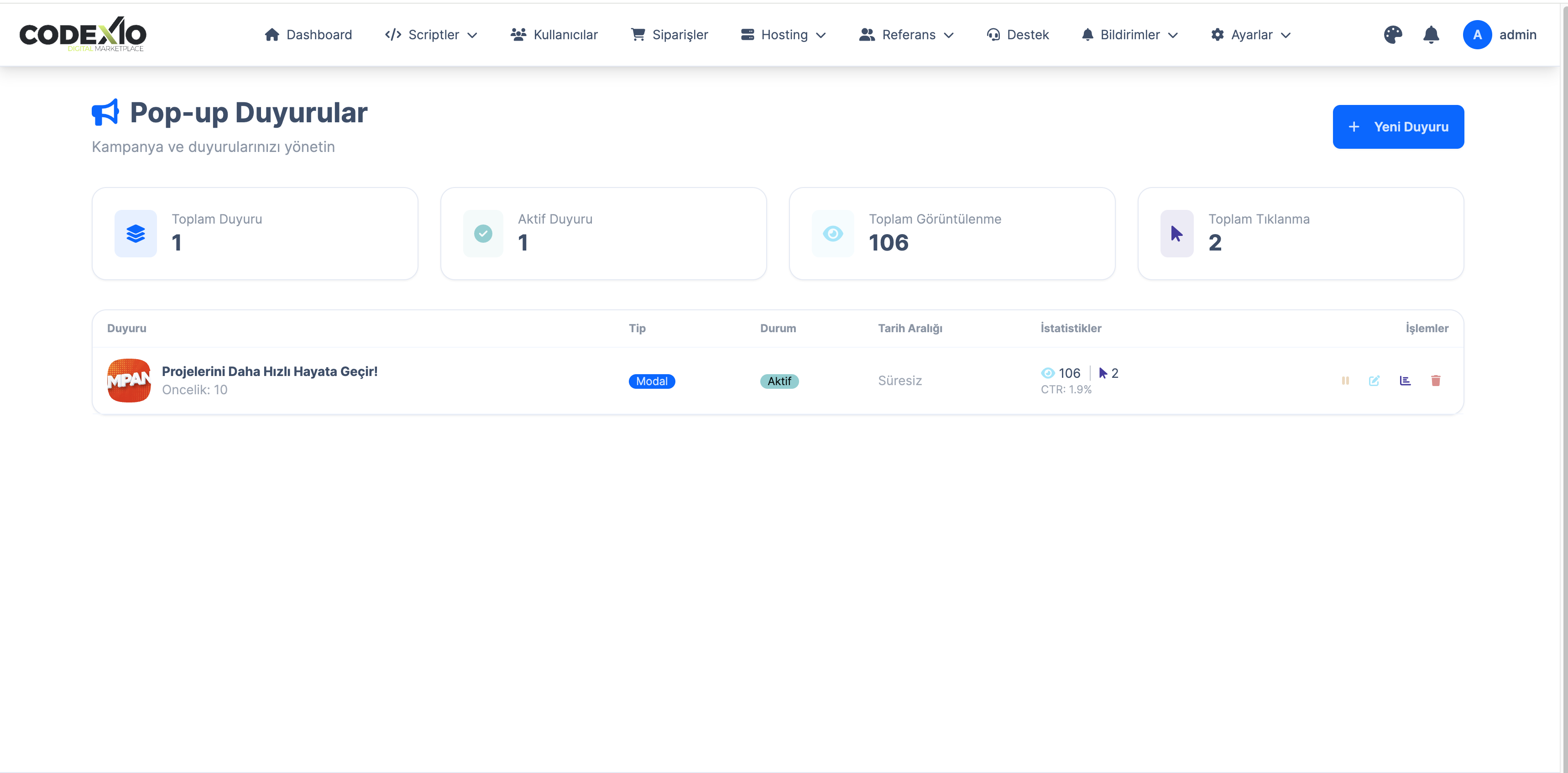 Pop Duyuru Modülü, Codexio altyapısı kullanan projeler için geliştirilmiş, esnek ve kullanıcı dostu bir duyuru çözümüdür.